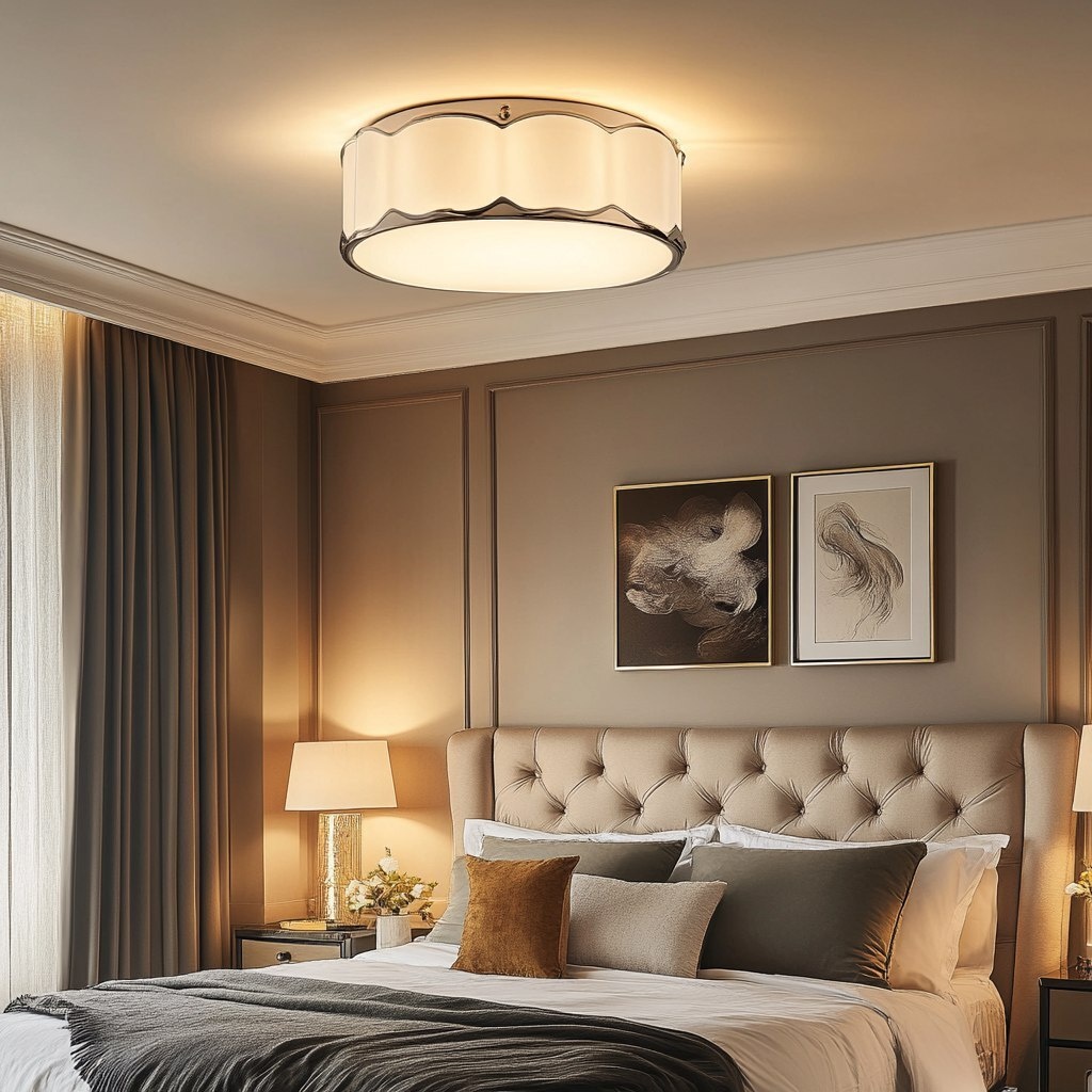 Создано на основе запроса: Refined bedroom interior with chrome batten fix ceiling light, Art Deco opal matt glass shade, soft lighting