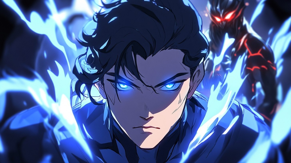Создано на основе запроса: A digital illustration in anime,manga and fantasy style featuring Sung Jinwoo from Solo Leveling with glowing
