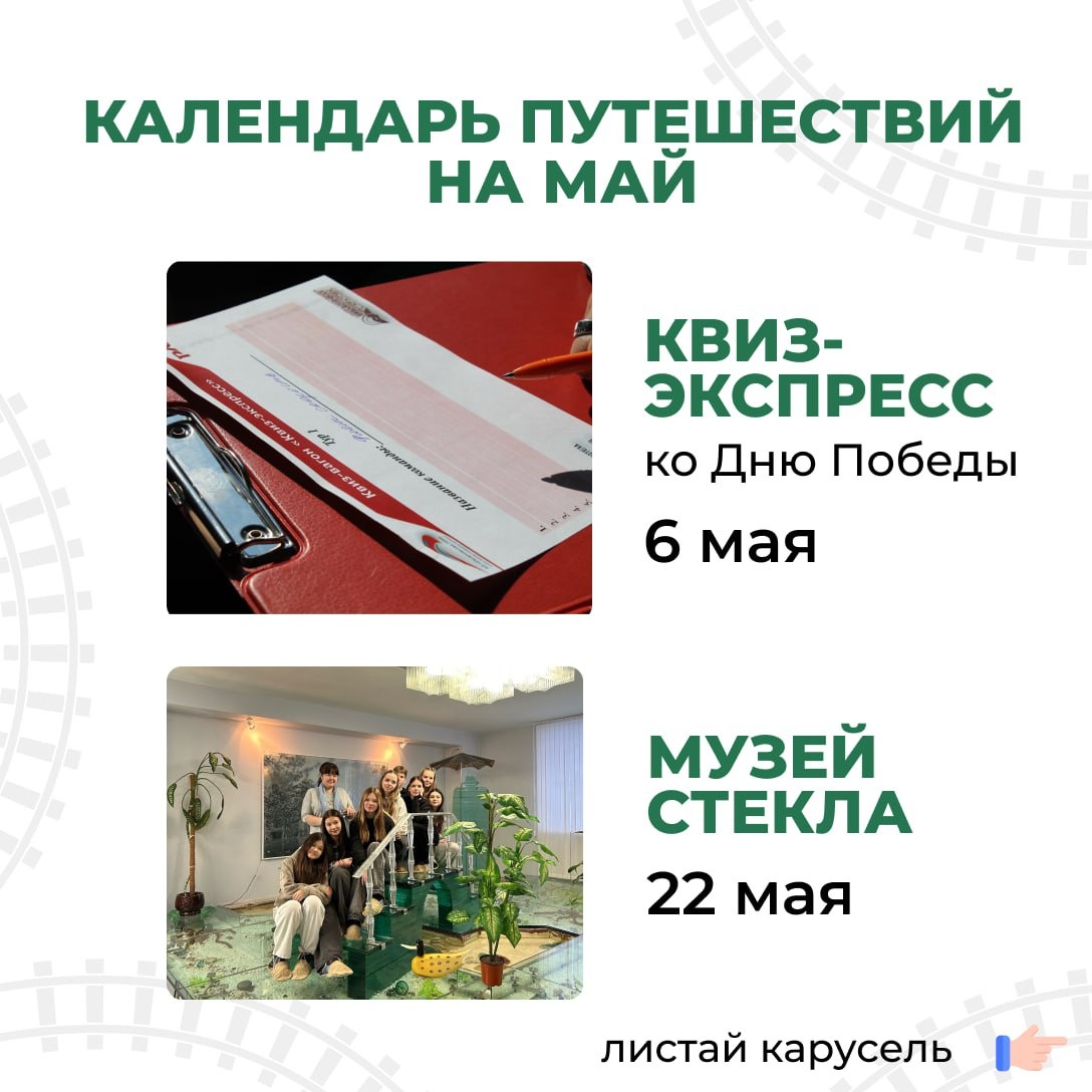 🤩 Календарь путешествий на май уже готов! Вас ждет много интересных мероприятий, поэтому скорее выбираем самые интересные и записываемся! 🔸Квиз-вагон «Квиз-экспресс» 📆 Дата проведения: 6 мая 2025 года Увлекательный квиз в электричке, который в этот раз будет посвящен 80-летию Победы в Великой Отечественной войне. Участие в квизе - это хороший способ провести вечер с семьёй или друзьями, размять мозги и получить новые позитивные эмоции. 🔸Музей стекла предприятия АО "Салаватстекло Волга" 📆 Дата проведения: 22 мая 2025 года Уникальные выставочные залы с искусными произведениями из стекла ручной работы уже ждут вас! 🔸Экскурсия «Ртищево - перекресток дорог России!» 📆 Дата проведения: 24 мая 2025 года Местные жители с гордостью говорят, что Ртищево - это город железнодорожников. Наших Пассажиров ждет увлекательная пешеходная экскурсия с подробным рассказом об истории города и интересных фактов. Комплексный обед и ужин включен. 🔸Экскурсия «Аткарск - уездный городок» 📆 Дата провед