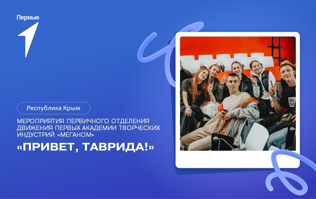 ✨ Добро пожаловать в мир вдохновения и новых возможностей! Вы готовы открыть для себя невероятные горизонты творчества и самовыражения? Тогда не упустите шанс стать частью уникального проекта под названием «Привет, Таврида», организованного первичным отделением Движения Первых академии творческих индустрий «Меганом»! 🌈 Почему стоит присоединиться? Представьте себе живописный Крым, где солнце, море и творчество сливаются воедино! На наших мероприятиях вы сможете не только погрузиться в удивительную атмосферу, но и познакомиться с единомышленниками, обменяться опытом и, самое главное, создать нечто удивительное, выходящее за рамки обыденности. Наша цель — сформировать новое поколение активных и сознательных граждан, готовых уважать культурное наследие своей страны и вносить свой вклад в его развитие. 🌟 Кто может участвовать? Если вам от 14 до 22 лет и вы готовы заниматься творческой деятельностью, мы ждем именно вас! Пригласите своих друзей, создайте команду из минимум 10 человек