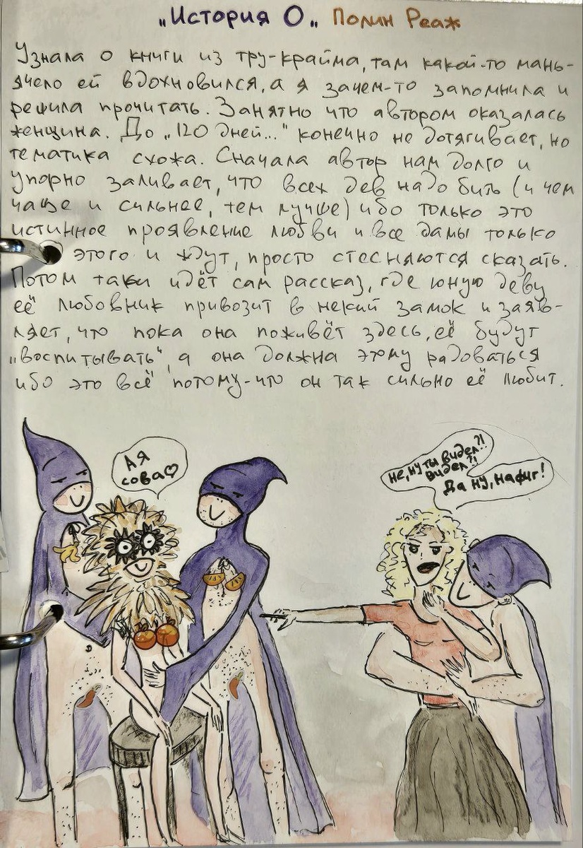 Узнала о книги из тру-крайма, там какой-то маньячело ей вдохновлялся, а я зачем-то запомнила и решила прочитать. Занятно что автором оказалась женщина. До «120 дней...» конечно не дотягивает, но тематика схожа. Сначала автор нам долго и упорно заливает, что всех дев надо бить (и чем чаще и сильнее, тем лучше) ибо только это истинное проявление любви и все дамы только этого и ждут, просто стесняются сказать. Потом таки идёт сам рассказ, где юную деву её любовник привозит в некий замок и заявляет, что пока она поживёт здесь, её будут «воспитывать», а она должна этому радоваться ибо это всё потому-что он так сильно её любит. Дева-дура, такая, ну ок, он жеж сказал что любит, значит всё отлично. В замке происходит полный спектр непотребств с хорошим тамадой и конкурсами, после чего деву выпускают в мир, подарив волшебное колечко и теперь она доступна всем, кто это колечко опознает. Её всё устраивает, главное что мужик её любит. Мужик от столь сильной любви к ней дарит деву какому-то англич