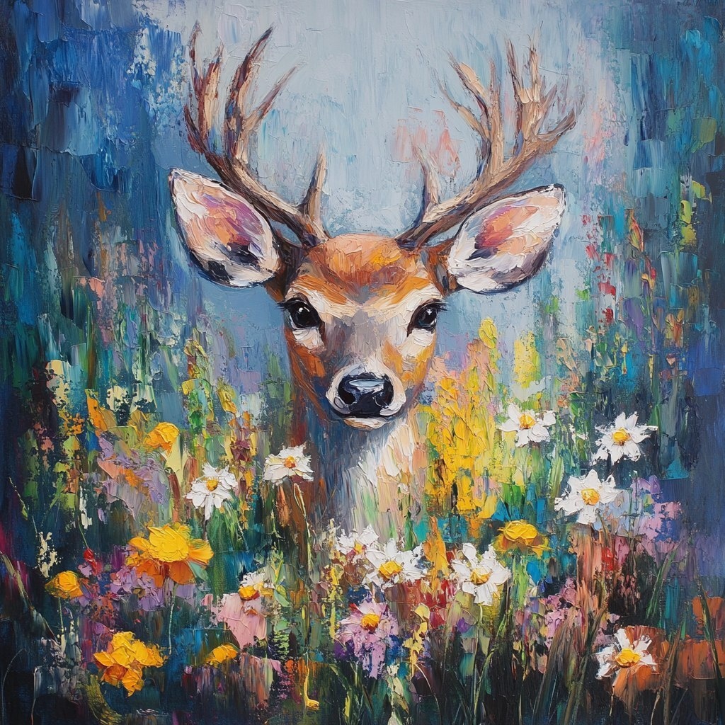 Создано на основе запроса: Deer surrounded by flowers oil painting