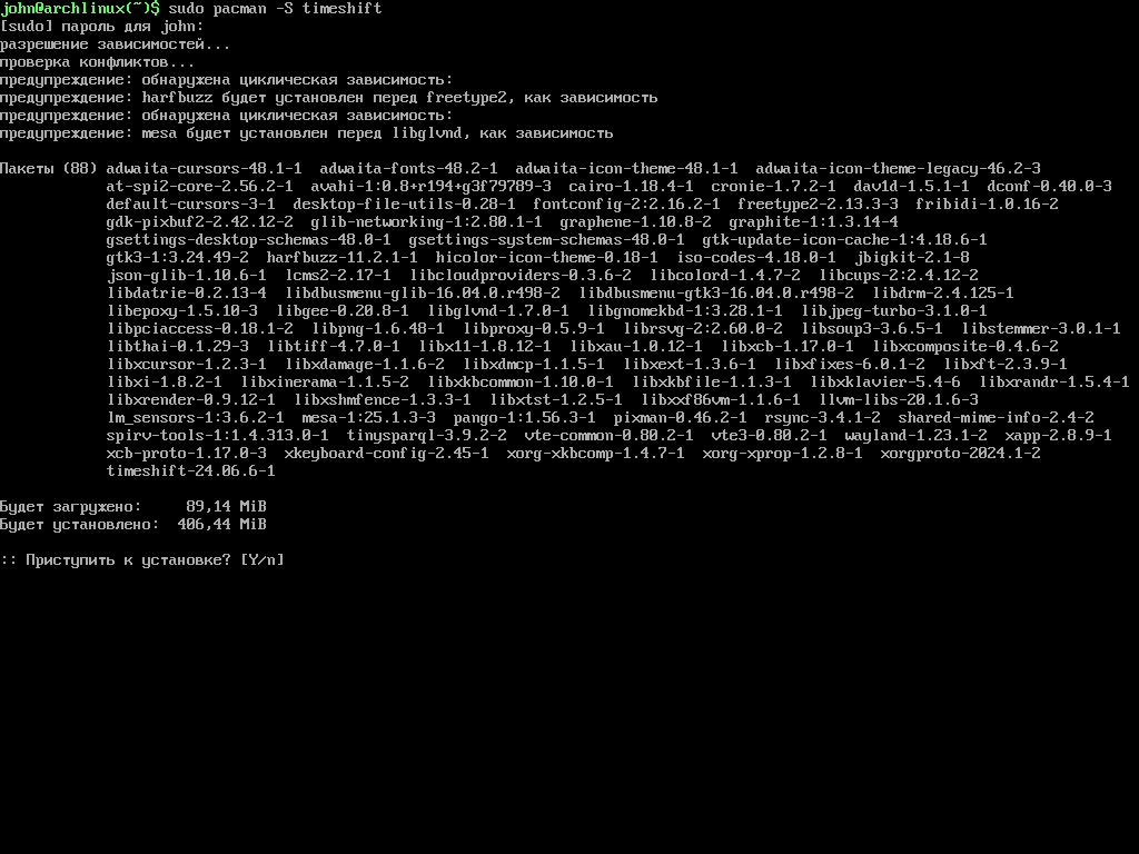 Установка. Для начала установим пакет Timeshift опять же в контексте Arch Linux, воспользуемся следующей командой: