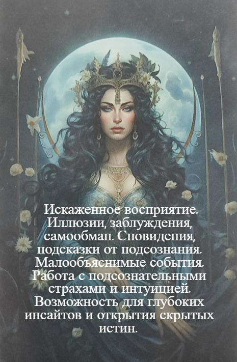 Период неясности или обмана, когда нужно быть особенно осторожным и внимательным. Неопределенность, подвешенное состояние, много вопросов и мало ответов. Интуиция и внутреннее видение могут открыть новые перспективы и инсайты. Будьте осторожны с поспешными выводами. Доверяйте своим ощущениям, но не забывайте проверять факты и оставаться внимательными.