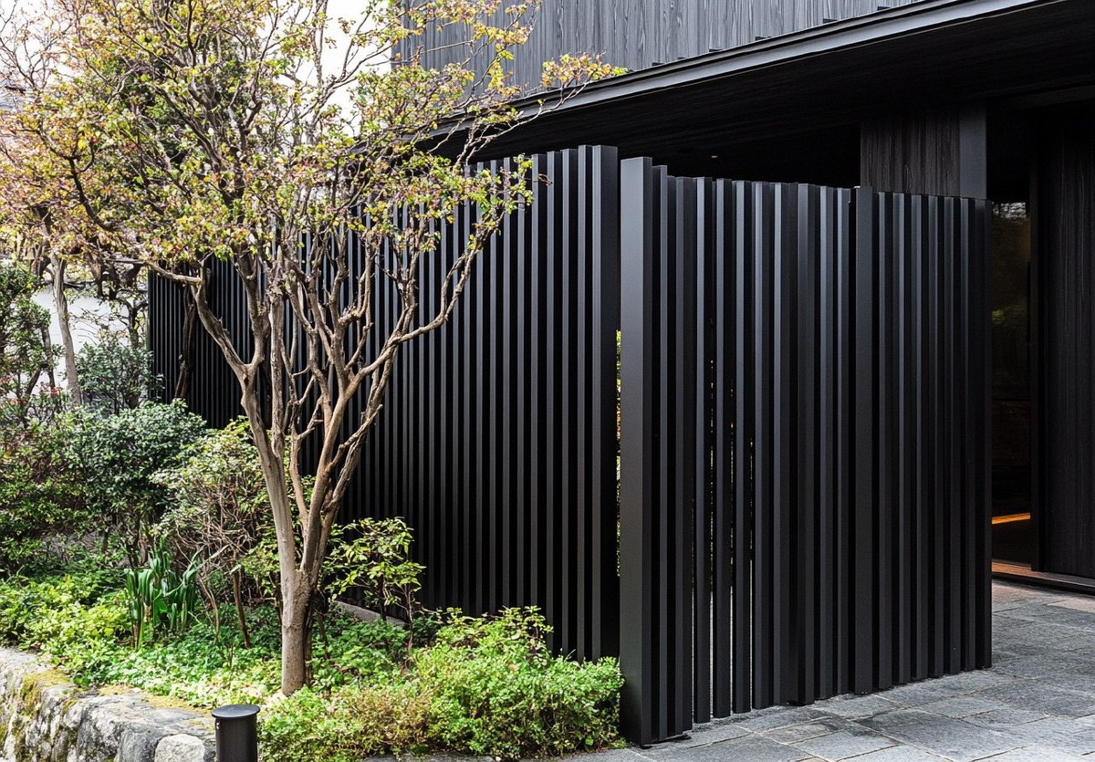 Создано на основе запроса: Black flat iron slats, a modern house fence in Japan