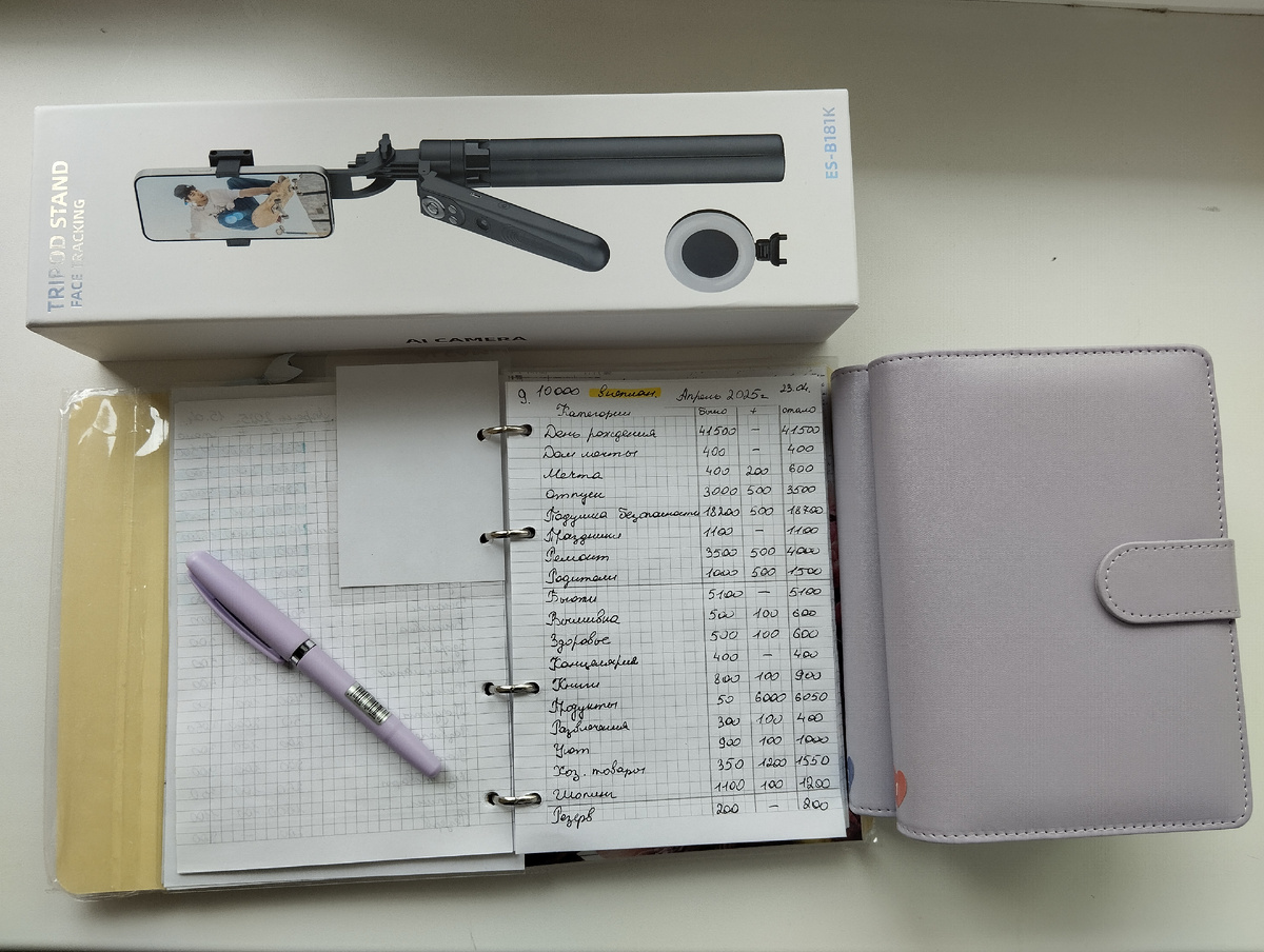 В семейной жизни часто случаются приятные и не очень моменты. Вот и у меня – неожиданно получила от мужа только 10 000 рублей, ремонт автомобиля оказался затратным. Поэтому строить планы без учета подобных форс-мажоров опасно. Всем привет! Меня зовут Саша, мне 38 лет и я распределяю бюджет по системе конвертов! Сегодня 23 апреля 2025 года, у меня на канале уже 70 подписчиков! Рада, что вы все со мной! 🤎🤎🤎 Распределение сегодня в формате статьи, так как сумма маленькая. Начнем, пропишу только те категории куда были внесения! Тут была покупка штатива (смотри фото выше) на 2600 и следующая цель планшет (конечно же буду использовать его для приложения электронных схем для вышивки). Было 400 рублей, добавила 200 рублей и становится 600. Было 3000, внесла 500 рублей и стало 3500. 18200 в конверте, добавила только 500 рублей и становится 18700. Было 3500, внесла 500 и стало 4000 ровно. К 1000 рублей добавила 500 и стало 1500 рублей. Любимое хобби. Было 500 рублей, добавляю 100 и станови