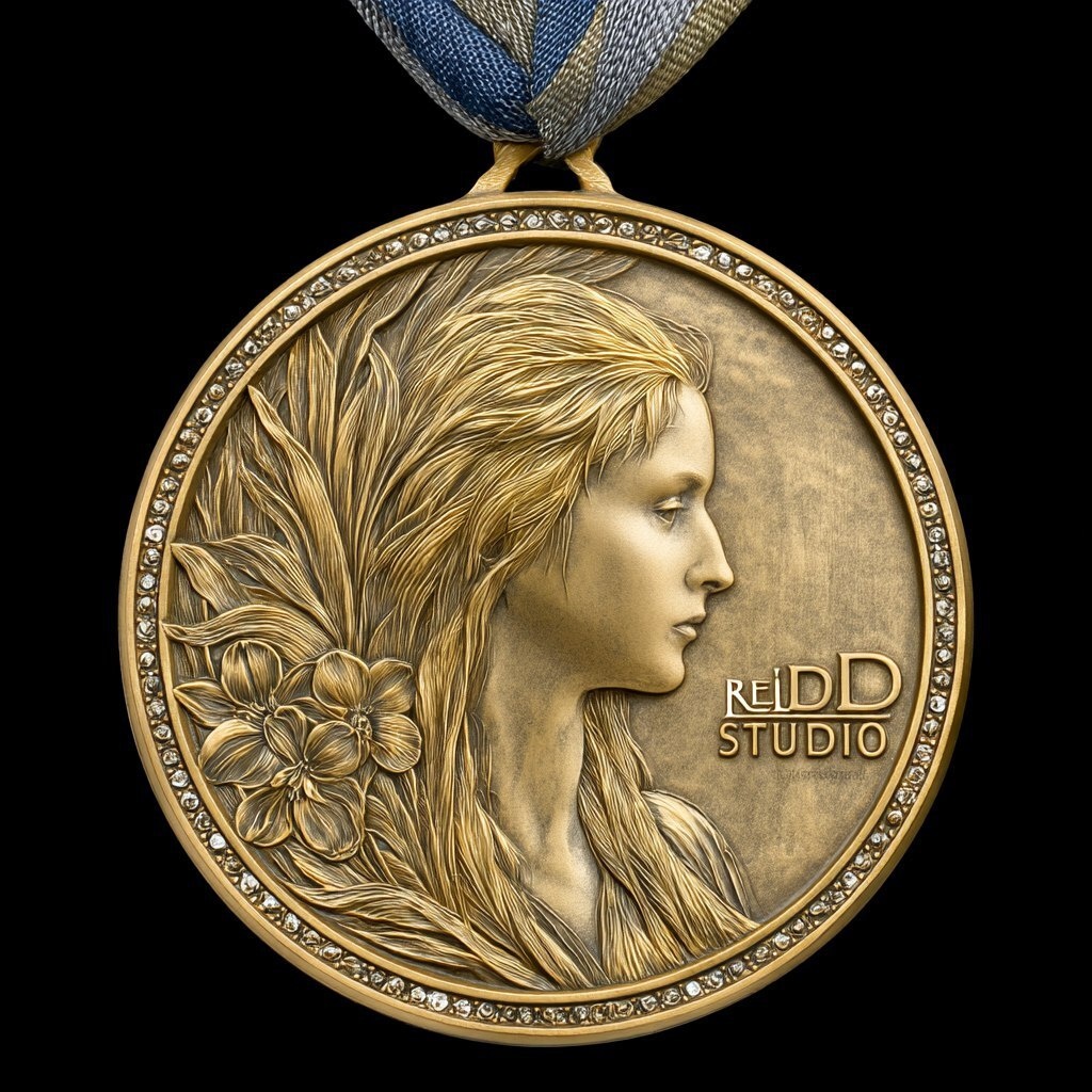 Создано на основе запроса: Gold medal with a relief image of a woman's hand with scissors "Red Studio", diamonds around the medal