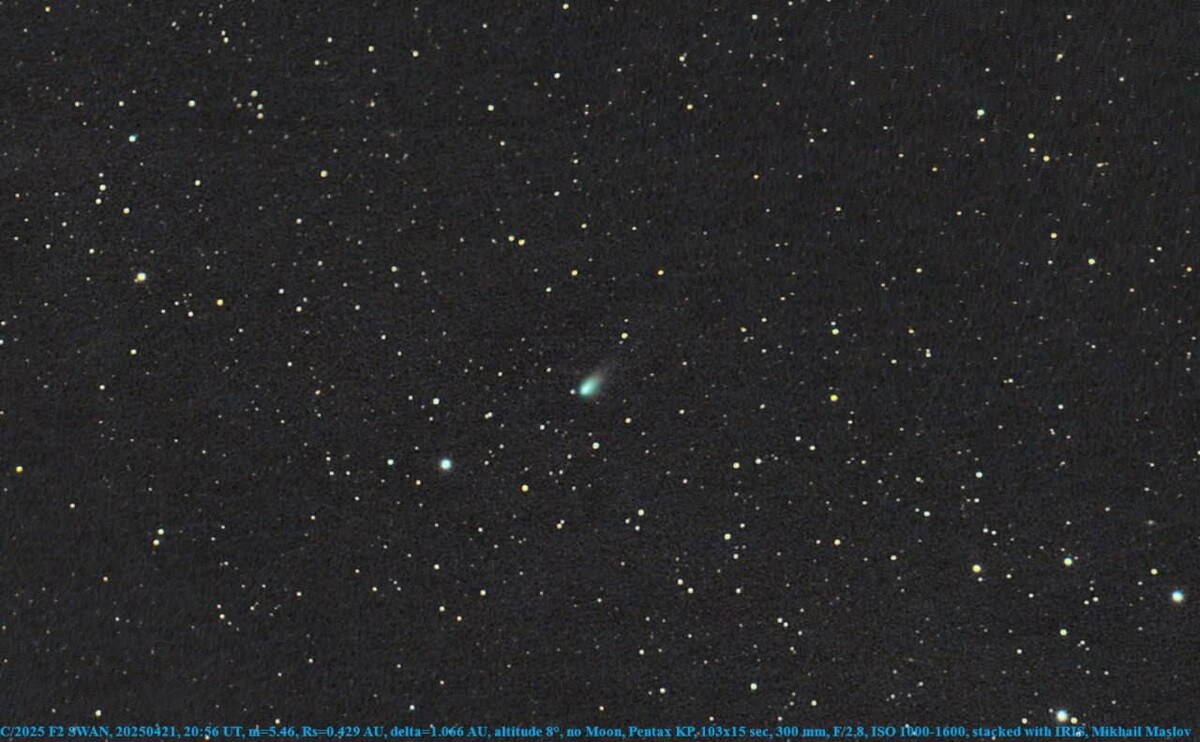 — Михаил Маслов, инженер обсерватории «Вега» Новосибирского государственного университета В первой половине апреля комета проявляла высокую активность, демонстрируя длинный ионный хвост. Однако в последние дни ее яркость перестала расти, а хвост практически исчез. Это может указывать на то, что комета, вероятно, разрушается и может полностью распасться в ближайшие дни или недели. Я ее сфотограф