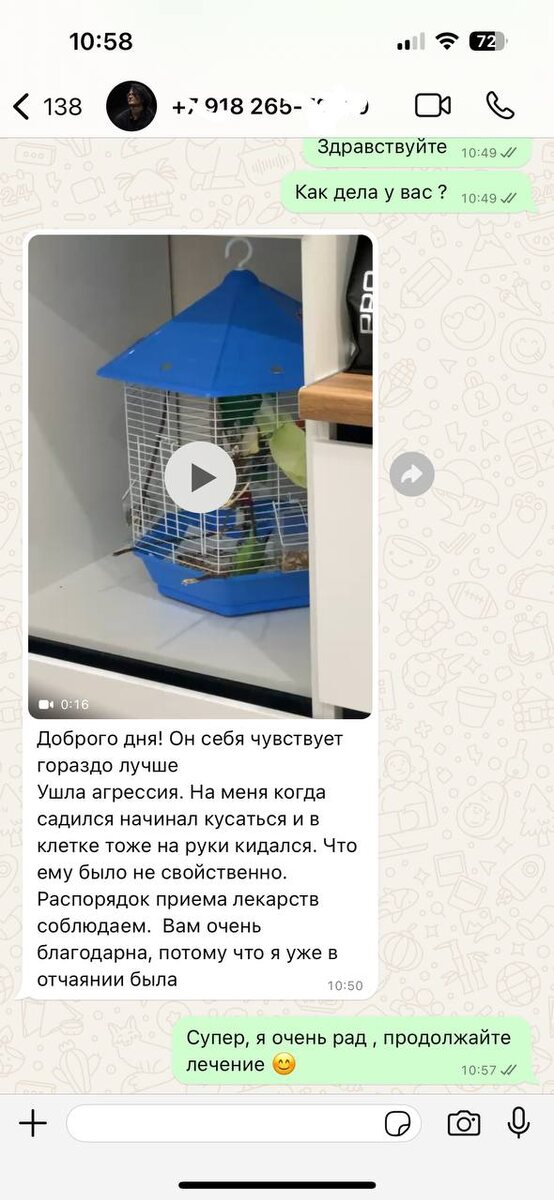 Когда владельцы вовремя обращаются за помощью и следуют всем рекомендациям — результат не заставляет себя ждать. Агрессия у попугая ушла, состояние стабилизировалось. Благодарю за доверие! #отзыв