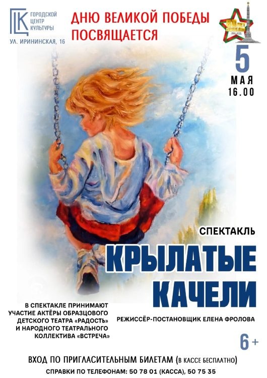 В Городском центре культуры пройдёт литературно-пластический спектакль «Крылатые качели» по материалам интернет-проекта «Молодая Гвардия» (https://www.molodguard.ru/heroes8014.htm) с использованием современной сценографии и пластических форм. Пьеса основана на реальных событиях. В основу сюжета легли письма детей, живших во время Великой Отечественной войны. Каждый из этих детей, познав горе, смог описать ужасы войны, оставив память для будущих поколений. 📌ВХОД ПО ПРИГЛАСИТЕЛЬНЫМ БИЛЕТАМ, которые можно приобрести заранее в кассе (бесплатно). Справки по ☎️ +375 (232) 50-78-01, +375 (232) 50-75-35 📆 5 мая в 16:00 📍г. Гомель, ул. Ирининская, 16