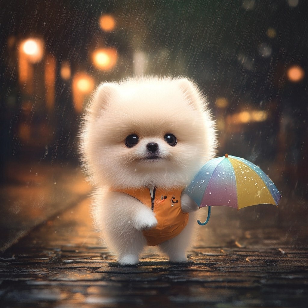 Создано на основе запроса: a cute Pomeranian wearing a tiny raincoat and holding a colorful umbrella, standing in the rain on a cobblestone