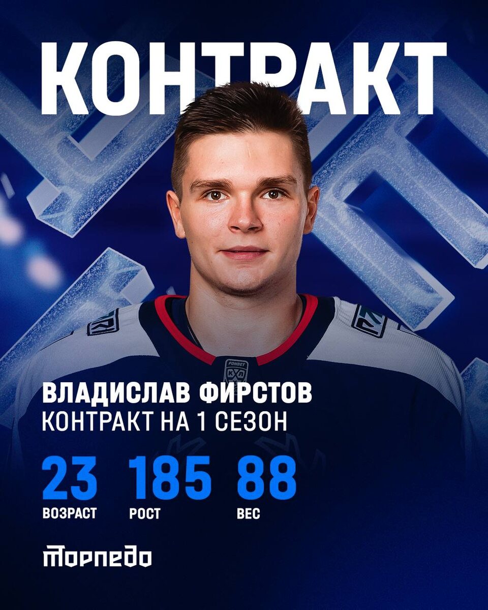 Владислав Фирстов 🦌 остается в «Торпедо» Нападающий Владислав Фирстов в предстоящем сезоне продолжит защищать цвета хоккейного клуба «Торпедо» ✍️ Новый контракт с 23-летним форвардом подписан сроком на один год. В минувшем Чемпионате КХЛ Владислав вошел в пятерку самых результативных игроков «Торпедо», заработав 31 (14+17) балл по системе «гол+пас». Всего в составе нижегородцев у Фирстова – 193 игры и 98 (47+51) очков. Желаем новых успехов вместе с нашей командой! 💪