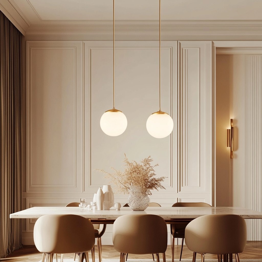 Создано на основе запроса: a dining room with high ceilings, featuring a 3Chain Pendant Light in polished brass and large 360mm opal matt