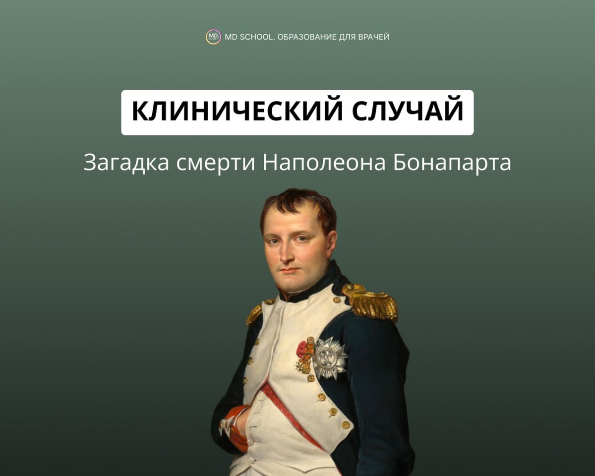 Загадка смерти Наполеона Бонапарта. Попробуете разгадать? 💡Наполеон Бонапарт, 51 год, бывший император Франции, находился в ссылке на острове Святой Елены. Пациент перед смертью жаловался на слабость, потерю веса, плохой аппетит, тошноту, боли в желудке. Состояние усугубилось за 2 дня до смерти в виде тахикардии. Он умер там 5 мая 1821 года. Вскрытие было проведено на следующий день его личным врачом Франческо Антоммарки в присутствии британских докторов и французской свиты. Результаты вскрытия после смерти (отчёты 1821 года): ➖Почти вся внутренняя поверхность желудка была поражена раковой тканью. ➖Желудок был наполнен чёрной жидкостью, похожей на «кофейную гущу» — симптом желудочного кровотечения. ➖Язва с прободением (6–7 мм в диаметре) в нижней части желудка, прикрытая спайками между желудком и печенью. ➖Вся ткань вокруг язвы была отёчна и уплотнена (индурация) — характерно для опухоли. ➖Только малый участок у пищевода выглядел здоровым. Разбор альтернативных гипотез описали в