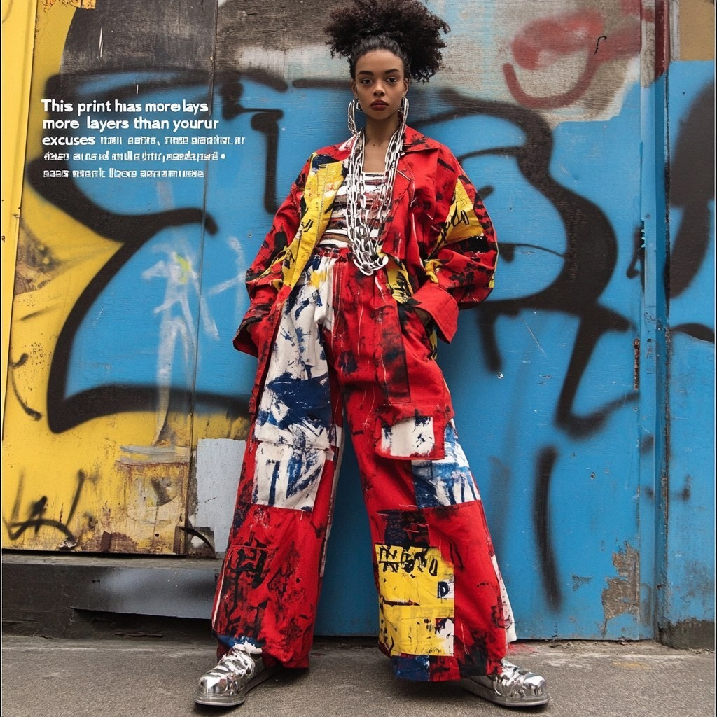 Создано на основе запроса: Full-length statement shirt-jacket layered over wide-leg printed trousers, digital abstract motifs with bold typography: "This print has more layers than your excuses", high-volume hair, silver jewelry, maximalist attitude, heartbreak-chic streetwear editorial
