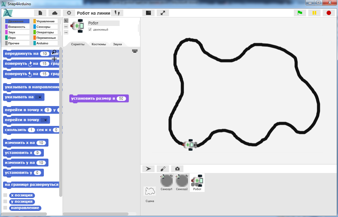 Продолжим. Ранее мы настроили проект для работы с роботом на линии. Теперь - программирование в среде Snap4Arduino. Вариант от А.Григорьева. • Снова откройте среду Snap4arduino. • Загрузите проект "Робот на линии.xml" командой "Файл", "Открыть". Далее мы будем составлять программу для робота, убедитесь, что выбран именно спрайт "Робот". Обратите внимание, что поле скриптов спрайта "Робот" уже содержит блок "Установить размер в", который мы туда ранее поместили. Масштаб отображения сцены можно менять кнопкой, расположенной над сценой слева, это позволяет с большим удобством работать со скриптами. В нашем проекте мы будем использовать пропорциональное регулирование: чем дальше линия отклонилась от средней позиции, тем быстрее робот будет поворачиваться в соответствующую сторону, чтобы линия оказалась снова посередине. Давайте для наглядности создадим необходимые переменные и назовём их понятными именами. Нам нужны 4 переменные: "яркость1", "яркость2", "ошибка_положения_линии", "управляющ