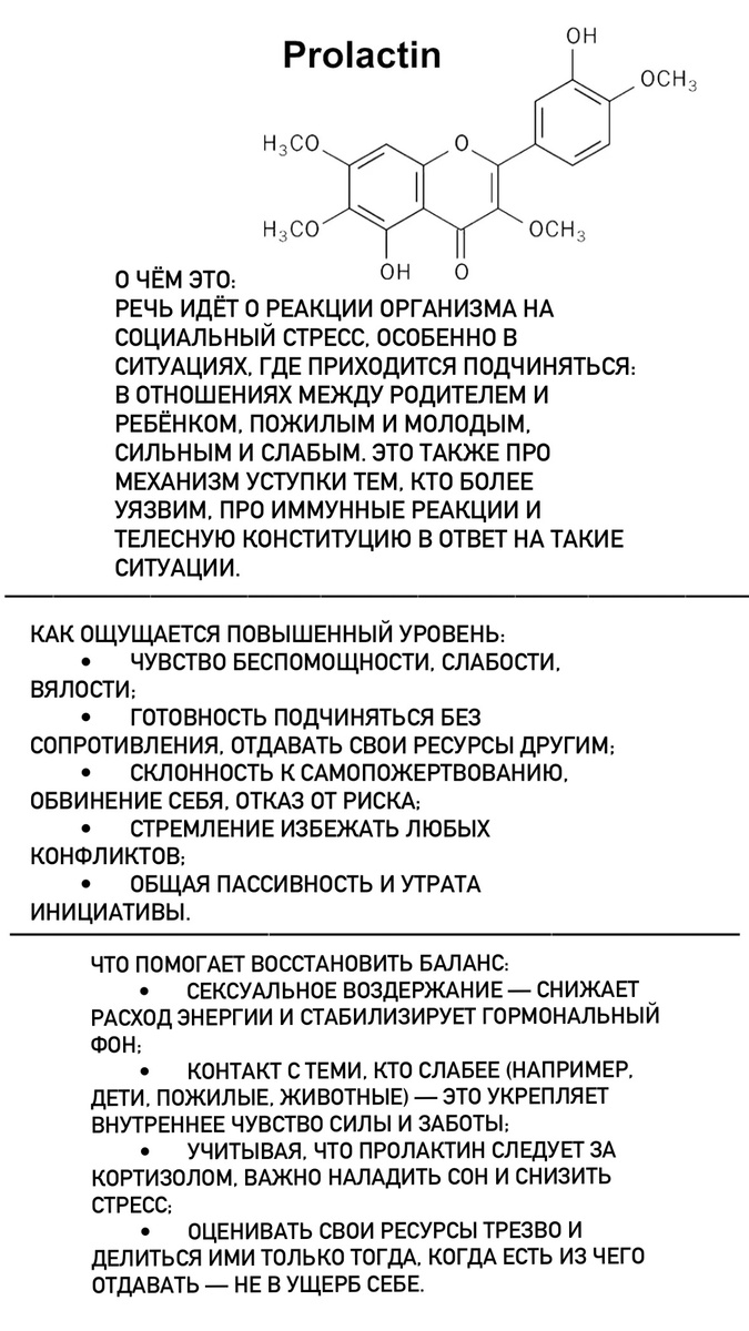 С психосоматической точки зрения повышенный пролактин может быть связан с рядом эмоциональных и психологических состояний. Вот основные возможные причины: 1. Подавленные материнские инстинкты или их гиперактивация Пролактин — гормон, в первую очередь связанный с материнством (лактацией, заботой). Его избыток может символизировать: • Нереализованное желание заботиться, быть нужной. • Сильную опеку над близкими, особенно детьми, даже если они уже взрослые. • Чувство вины перед ребёнком или родителями. ⸻ 2. Эмоциональная неудовлетворённость Повышенный пролактин может сопровождать: • Хроническую потребность в любви, ласке, тепле. • Ощущение, что ты даёшь больше, чем получаешь. • Подавление сексуальности или конфликт между сексуальной и материнской ролями. ⸻ 3. Стресс, усталость, эмоциональное выгорание Организм может “включать” пролактин как защитную реакцию: • На переутомление и перенапряжение. • Когда человек не даёт себе отдыхать или не разрешает себе слабость. ⸻ 4. Стр