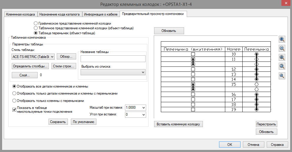 Показать в таблице неиспользуемые точки подключения – Определяется необходимость включения в таблицу перемычек всех точек подключения клемм, даже если не ко всем точкам подключены провода или жилы кабелей.