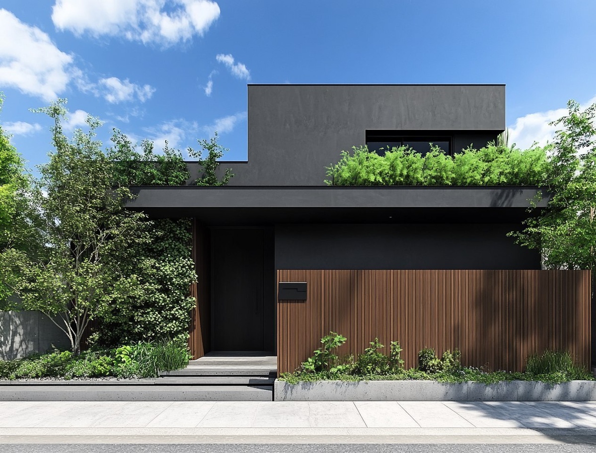 Создано на основе запроса: Photograph of a front view of a simple, modern house in Tokyo with dark grey walls and a brown wooden fence