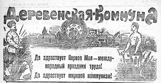 Такое изображение было опубликовано в газете «Деревенская коммуна» 1 мая 1920 года. Интересно, что слово «здравствует» написано без «в». По современным нормам русского языка это ошибка, но привычный нам свод правил русской орфографии и пунктуации был принят позже, в 1956 году. Поэтому нельзя сказать наверняка, ошибка это или в те годы любое написание считалось нормой. В конце концов, в начале XX века процент грамотных людей в России был совсем невелик.