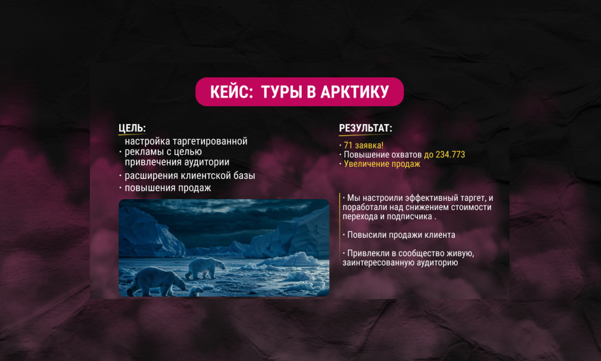 Всем привет! Меня зовут Галина Тимакина – я маркетолог и основатель рекламного агентства Timakina Marketing. Хочу поделиться с вами крутым кейсом по продвижению компании по организации туров в Арктику. На первый взгляд, здесь нет ничего сложного - знакомая ниша туризма, в которой у нас уже десятки кейсов. Однако изюминка этого проекта в уникальном направлении - Кольский полуостров, Арктика. Данные направления - тренд последних лет, который будет нарастать еще долго. При этом целевая аудитория у таких туров - специфичная, так как стоимость путешествий высокая. Позволить себе такие поездки могут только люди с высоким доходом. Мы тщательно поработали над стратегий таргетированной рекламы, которая впоследствии принесла очень хорошие результаты - 71 заявку! Как мы это сделали? - компания по организации туров в Арктику “Tundra House”. Они предлагают клиентам уникальные туристические программы отдыха формата «Всё включено» на побережье Баренцева моря. В туры входит: Арктика - эксклюзивное на