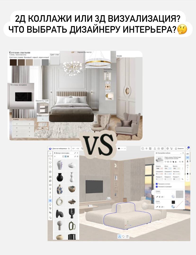 3D коллажи или 2D дизайн-проекты — что выбрать? В работе с заказчиками часто встаёт вопрос: какой формат подачи лучше? Давайте разберём плюсы и минусы обоих подходов. 2D-дизайн быстрее в реализации и отлично работает, когда нужно четко показать планировку, расстановку мебели или цветовую палитру. Это технически точный способ подачи, в котором меньше шансов на недопонимание. Но при этом такая подача может показаться «сухой», особенно для заказчиков без дизайнерского бэкграунда — не каждый способен «увидеть» объем по плоской схеме. 3D-коллажи, наоборот, захватывают эмоциями. Они помогают влюбиться в проект с первого взгляда, легко передают атмосферу, стиль, фактуры. Однако здесь больше рисков: они занимают больше времени, требуют навыков и, что самое главное — могут создать завышенные ожидания, если не совпадают с реальностью при реализации. А вы что чаще используете в работе — 2D или 3D? Делитесь своим опытом в комментариях.