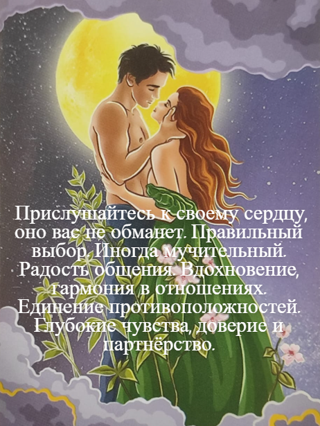 Прислушаться к своему сердцу и сделать единственно правильный выбор, причём выбирать можно не только возлюбленного или возлюбленную, но и что-то совершенно иное, не относящееся к личным отношениям. Карта советует не просто последовать за своим голосом сердца, а вступить с ним в диалог и только тогда сделать выбор. Всё тщательно обдумать и принять решение на «трезвую голову». В таком случае вы получите отличный шанс обрести гармонию в жизни и даже определить её дальнейший ход. Вера в правильность своего выбо