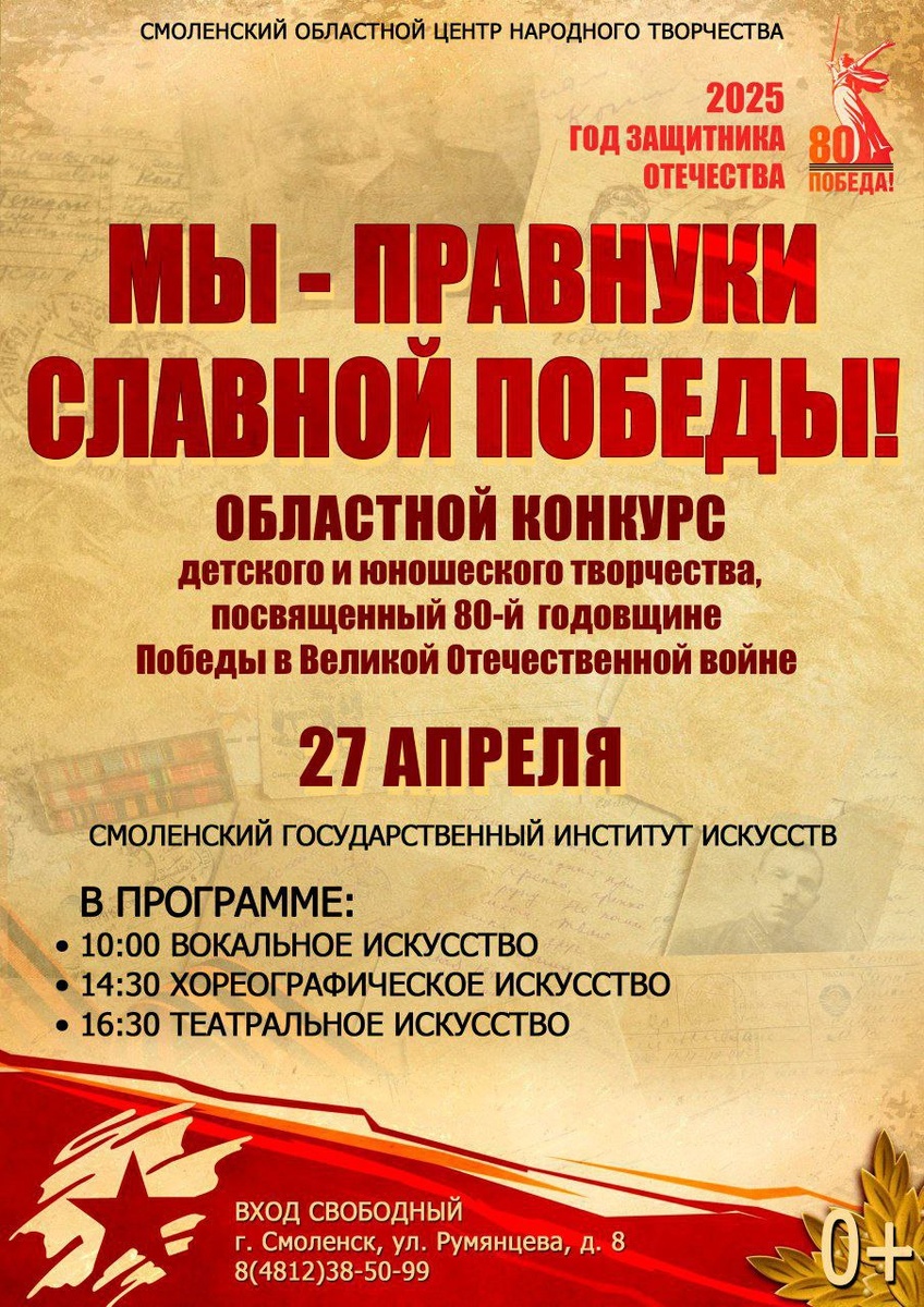 ✨️Уже в это воскресенье! 27 апреля в 10:00 в Смоленском институте искусств состоится областной конкурс детского и юношеского творчества «Мы – правнуки славной Победы!», посвящённый 80-летию Великой Победы. 🌟В программе – выступления юных талантов в трех номинациях: «Хореографическое искусство», «Театральное искусство» и «Вокальное искусство». ✨️Приходите поддержать артистов и насладиться их творчеством! Вход свободный 📍Адрес: ул. Румянцева, д. 8 ☎️Телефон: 8 (4812) 38-50-99 #СмоленскийЦентрНародногоТворчества