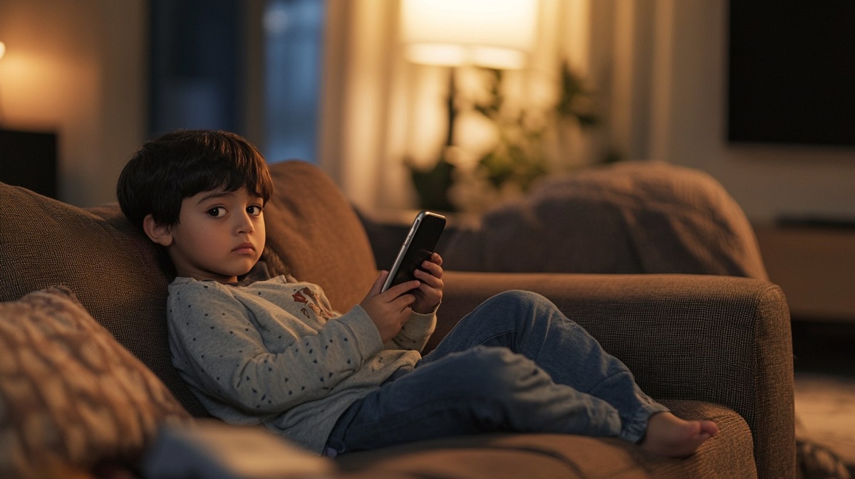 Создано на основе запроса: A realistic Iranian child, around 6 years old, sitting alone on a living room couch, holding a phone, looking