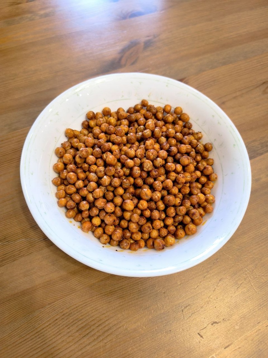 Хрустящая закуска из нута. Ингредиенты: Нут - 250г Масло - 15г Вода - 800 мл Соль, специи 1) Промыть и залить сырой нут холодной водой на 10-12 часов, либо варить 40-50 минут. Можно использовать готовый консервированный, тогда замачивать не нужно. 2) Слить оставшуюся воду и смешать нут с маслом, солью и специями (у меня сладкая и копчёная паприка, сухой чеснок). 3) Выложить нут на пергаментную бумагу и выпекать в духовке при 180 градусах не больше 30 минут. Лучше с конвекцией. Хрустящий нут - это полезная замена чипсам, а также можно добавлять нут в салат или боул. Кбжу на 100г: 453ккал/20,4г белков/11,2г жиров/67,3г углеводов #закуска