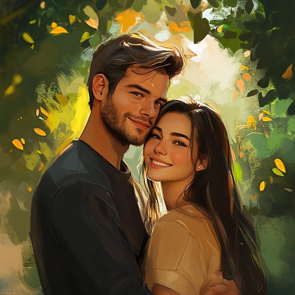 Создано на основе запроса: digital drawing of real couple in a garden with a blurry background