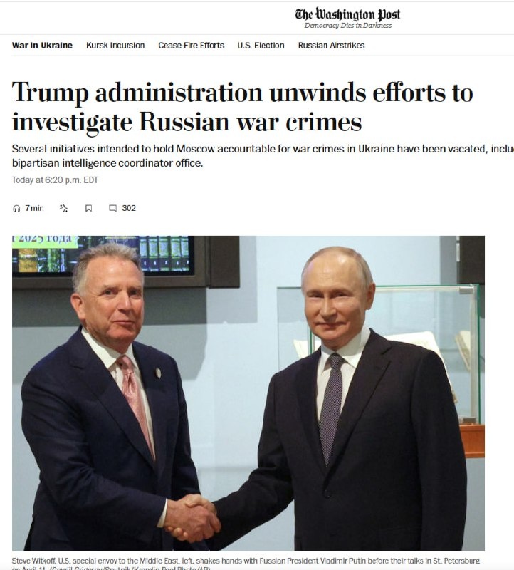 Новости хорошие: администрация Трампа сворачивает усилия по расследованию военных преступлений России - сообщает WP 🤨 Газета.РУ пишет немного иначе: В США упразднили группу по преступлениям РФ на Украине. «В ходе ранее не сообщавшегося шага» была упразднена должность координатора, которая была предусмотрена законом и которая «подразумевала сбор разведданных по всем госагентствам (США) о зверствах России, совершенных на Украине». 👍 Не, ну что-то он делает, трампулечка наш... Suum cuique Wars not make one great Democracy Dies in Darkness #хайп_дня #Про_СВО Рогов Илья 🇷🇺