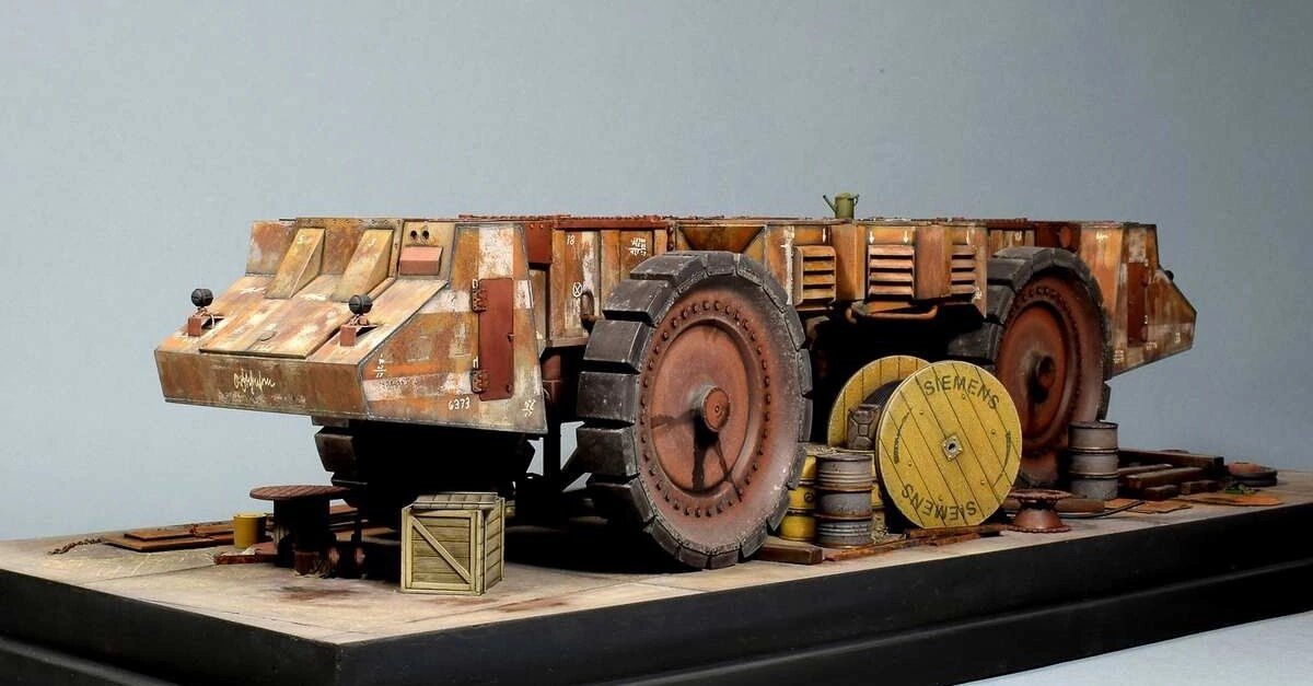 Krupp Raumer S =============================== От автора: "Всем привет, вот такая виньетка, на полноценную диораму не тянет. Известная модель от Takom с небольшими доработками (сварные швы общей длиной около 2 метров, оси приводов, гидроцилиндры и пр). Подставка самодельная (длина модели 420мм, основание около 500мм), ящики, инструменты, детали БТТ от Миниарат, остатки разных наборов и самодел. Фигурка - смола от Evolution-miniatures. Окрашено акрилами Тамия, 3 слоя обдирки с лаком для волос, многократные маски из скотча (это было очень утомительно), тонировка худ. маслом, смесями Wilder. Маркировка - сухие декали Wilder. В общей сложности около 15 слоев эффектов окраски и тонировки. Большинство этапов по DVD "Authentic Metal with Adam Wilder". " автор: Алексей Груздев (Алекс-Минск); масштаб: 1/35 ================================