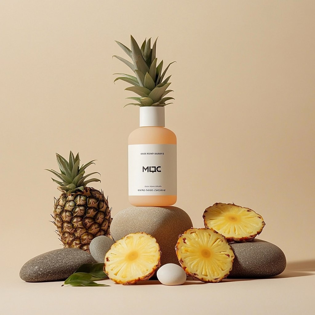 Создано на основе запроса: A minimalist product display for a beauty treatment bottle with a clean label, balanced on natural stones. Surrounded by sliced pineapples and fresh tea leaves. The composition is elegant and earthy, with soft beige background, artistic lighting, and sculptural elements. Editorial beauty ad style, high-resolution photography look --- Автоперевод: Минималистский дисплей продукта для бутылки для красоты с чистой этикеткой, сбалансированной на натуральных камнях. Как тебе такое изображение? 🤔 https://dzen.ru/id/65c0c65c86e4f837c27b24d7 #ИИ #AI #нейросеть #midjourney #art