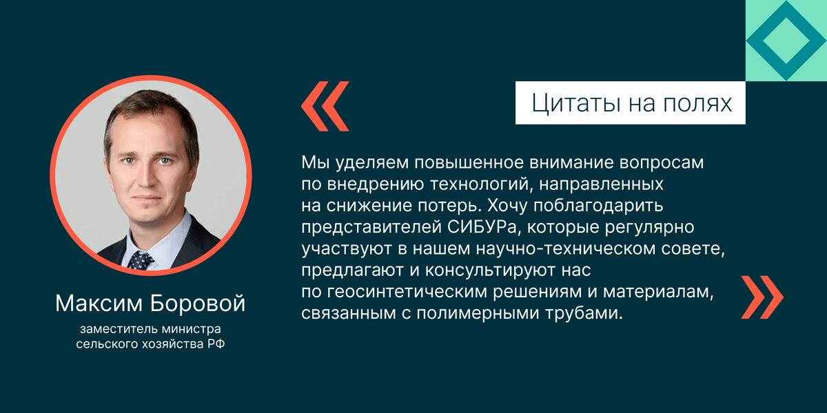 И сокращаем потери воды для орошения полей — с помощью полимеров. Вместе с НИИ мелиорации мы провели исследование, и его результаты поражают. Использование геосинтетики в открытых оросительных каналах сокращает потери воды в 300 раз! А еще повышает пропускную способность каналов — до 77%, экономя до 2,2 млрд кубометров воды в год по стране. Кроме того, геосинтетика продлевает срок службы открытых каналов до 50 лет (с 13 у традиционных решений), а расходы на материалы окупаются за 7–8 лет. Полимерные трубы тоже сокращают стоимость строительства оросительных систем, причем такие трубы служат в разы дольше металлических. А еще полимерные технологии микроорошения значительно повышают урожайность и позволяют экономить удобрения и посевную площадь. Нашу инициативу по использованию полимеров при реконструкции каналов поддержали на уровне Минсельхоза.
