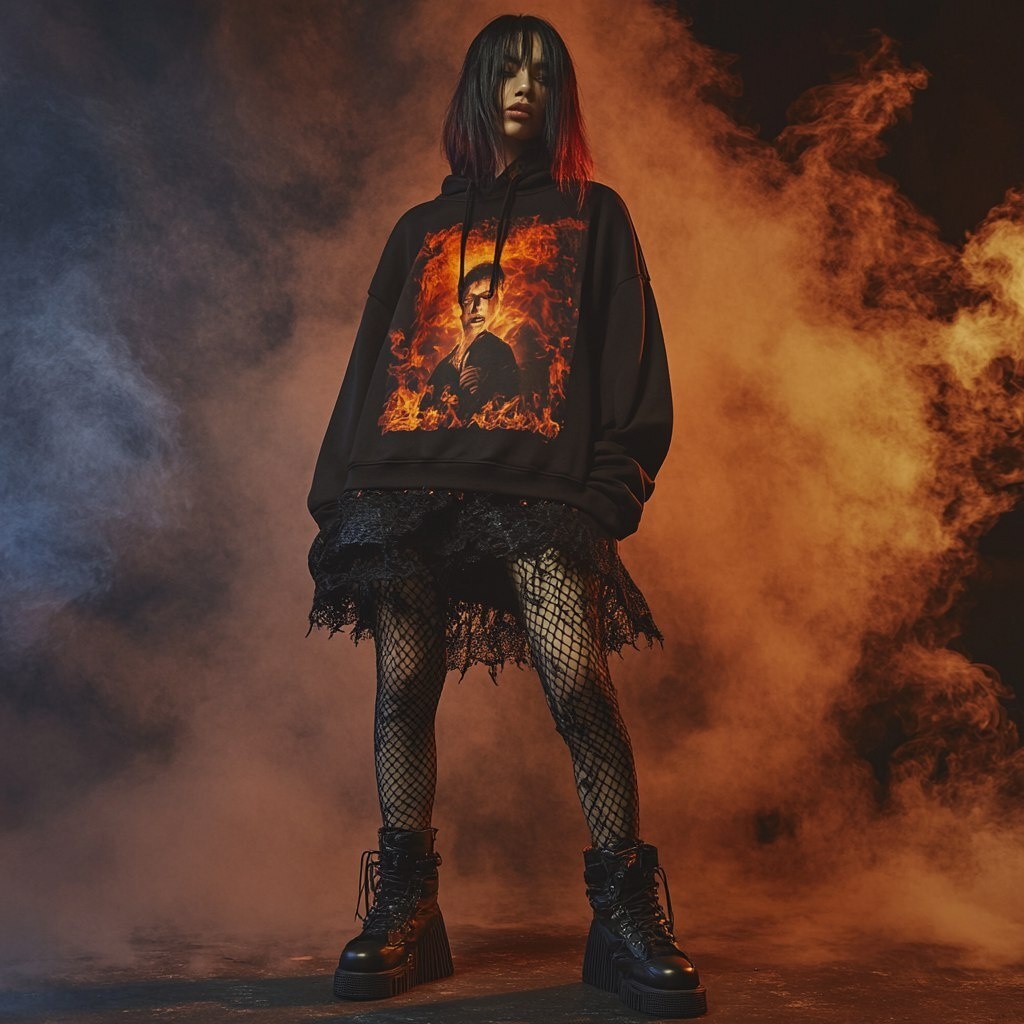 Создано на основе запроса: Full-length female model in oversized hoodie dress, digital print of a burning photo of a man across the front