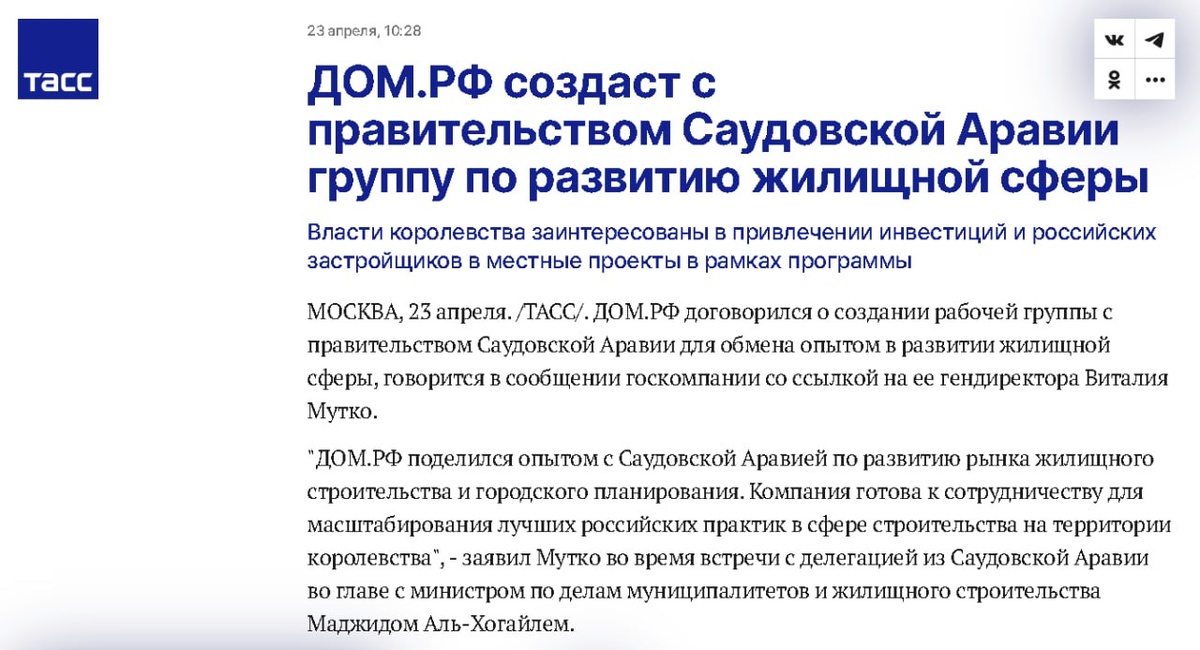 1 апреля forever ... "ДОМ РФ создаст с правительством Саудовской Аравии группу по развитию жилищной сферы Власти королевства заинтересованы в привлечении инвестиций и российских застройщиков в местные проекты в рамках программы. ДОМ РФ договорился о создании рабочей группы с правительством Саудовской Аравии для обмена опытом в развитии жилищной сферы, говорится в сообщении госкомпании со ссылкой на ее гендиректора Виталия Мутко. "ДОМ РФ поделился опытом с Саудовской Аравией по развитию рынка жилищного строительства и городского планирования. Компания готова к сотрудничеству для масштабирования лучших российских практик в сфере строительства на территории королевства", - заявил Мутко во время встречи с делегацией из Саудовской Аравии во главе с министром по делам муниципалитетов и жилищного строительства Маджидом Аль-Хогайлем" ... Напомните, запамятовал, в каких своих новых строительных проектах саудиты используют градостроительное планирование, а также архитектурные решения Некрасовки,