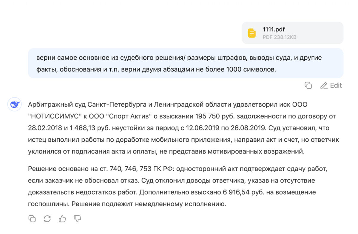 Идея вам сервиса :) - берете судебное решение в формате pdf, кидаете в ИИ и получаете самое важное, в удобном для анализа формате. Как это использовать я еще не придумал, но штука занятная. Сами судебные решения сейчас всегда публикуются в pdf, можно текст извлекать очень быстро и токенов занимает не так ж и много. На картинке я играюсь с deepseek ... Хотя тут любая ИИ работает на высоком качестве. Кстати, это реально наш суд, деньги взыскали :) (была апелляция, но суд подтвердил позицию, что работы сделаны, и что переписка в Скайпе принимается). Русский ИТ бизнес
