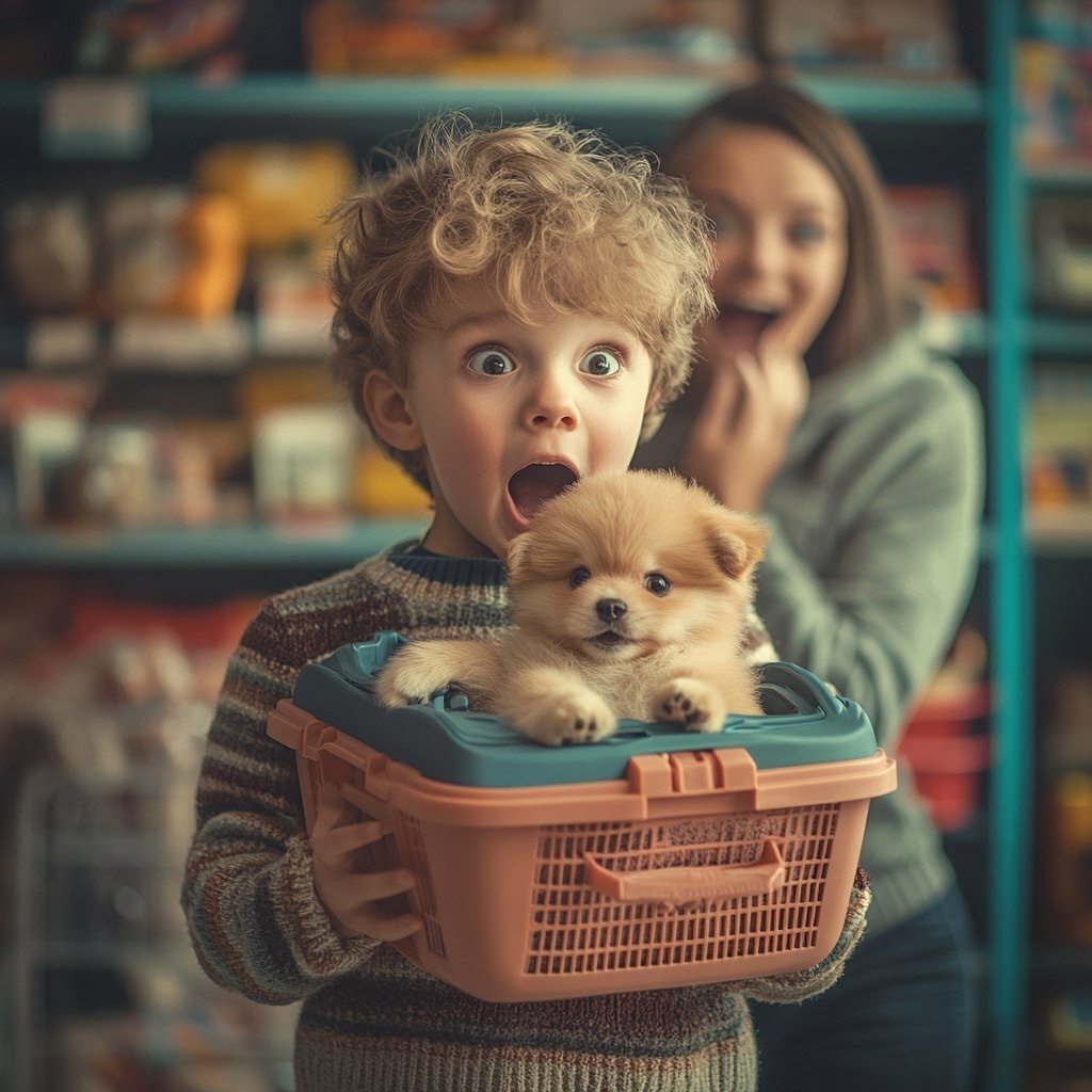 Создано на основе запроса: Child holding a small fluffy dog, toy store-style background, surprised parent holding a pet carrier