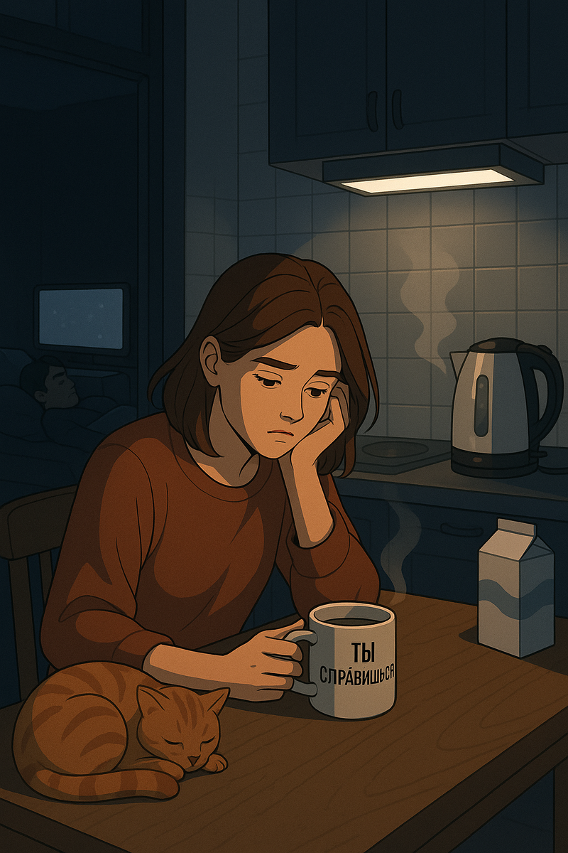 Когда вода закипает, она шумит. Почти как дождь. Только вместо окон — плитка, вместо ветра — люминесцентная лампа, подрагивающая на кухне. В таких звуках есть ритм. И этот ритм знает Алина. Ей двадцать шесть, и она слишком много времени проводит на кухне по ночам. Здесь безопаснее. Тут не спрашивают, почему ты не счастлива, если у тебя вроде всё есть. Здесь можно тихо плакать, и никто не услышит — даже если ты сама. На верхней полке стоит кружка с надписью «Ты справишься». Дарина подарила. Её голос в голове: «Если он говорит, что ты “слишком чувствительная”, это не значит, что ты не права». Алина тогда посмеялась. А теперь думает, что это была не шутка. Он снова заснул на диване. Телевизор шипит, как чайник, но в этом шуме нет уюта. Только фон. Только напоминание, что между ними всё реже слова и всё чаще — тишина, тяжёлая, как плед, которым он укрыт. Алина достаёт молоко из холодильника. Оно почти закончилось. Как и её способность объяснять, что она устала не от дел, а от невидимости.