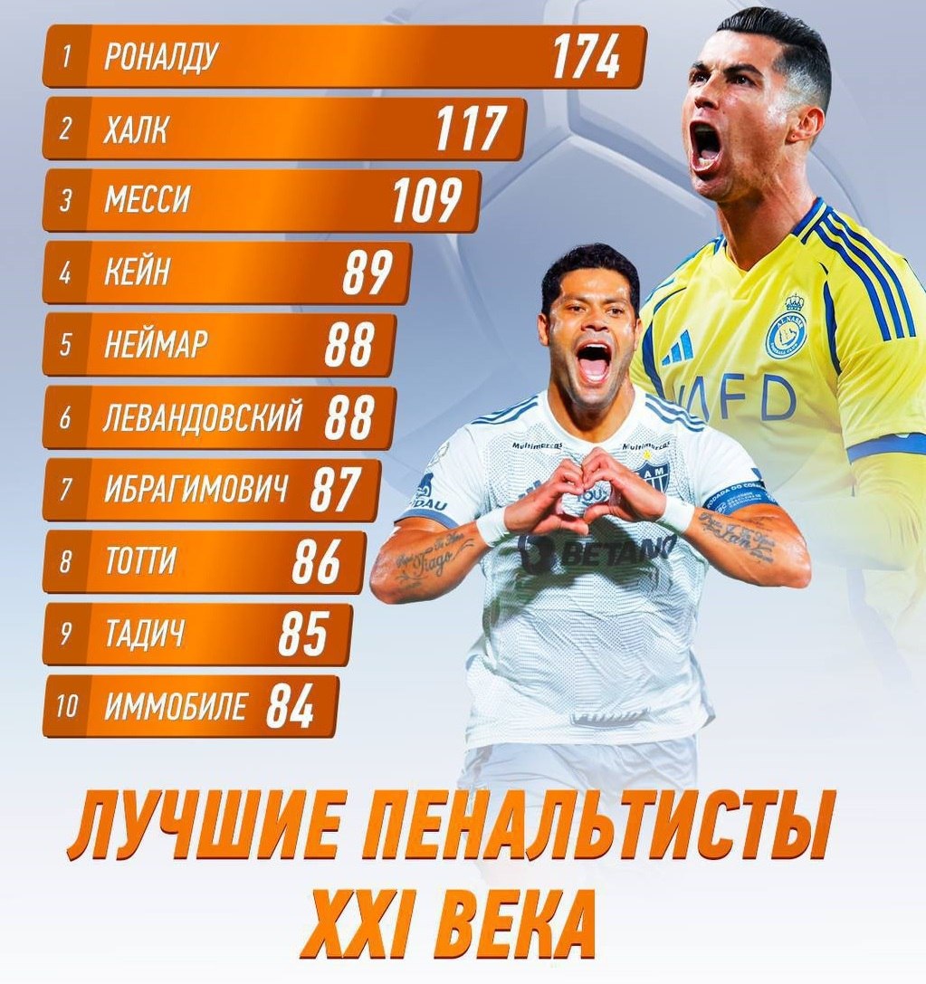 Кто в XXI веке реализовал больше всех пенальти? Конечно же Роналду – тут без сюрпризов. А вот второе место очень неожиданное. Оказывается Халк настрелял 117 голов с 11-метровой точки. А не Месси или Левандовски. Бывшему нападающему Зенита сейчас 38 лет и он до сих пор в строю. Играя с 2021 года за Атлетико Минейро он забил 122 гола в 237 матчах.