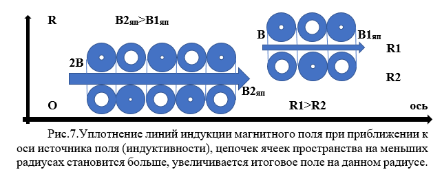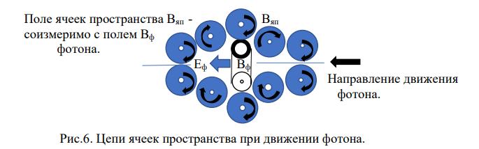 Часть пространства, занятая атомами, закономерно структурирована. Необходимо прояснить структуру материального поля, в частности магнитного. А также разобраться со структурой пространства, однозначно передающего гравитационное взаимодействие. Ткань пространства-времени способна передавать возбуждения без потерь, сжиматься, растягиваться, а также рваться (вероятно). Пространство не может поглощать энергию- это закон. Пространство поддерживает движение фотона практически без затухания миллионы лет! Сам фотон, исходя из предложенной выше гипотезы-идеи, является кольцом магнитного поля(Вф), с величиной индукции не достаточной для сжатия до размера частиц и двигающимся по направлению непрерывно создаваемого (Еф) собственного электрического поля, в поле магнитном(Вяп) ячеек пространства (рисунок6). Размеры фотонов и ячеек пространства соизмеримы. Поле Вф - мнимое, фотон- это акт возбуждения пространства порцией электрического поля. На рисунке 6 показано движение фотона в пространстве без по