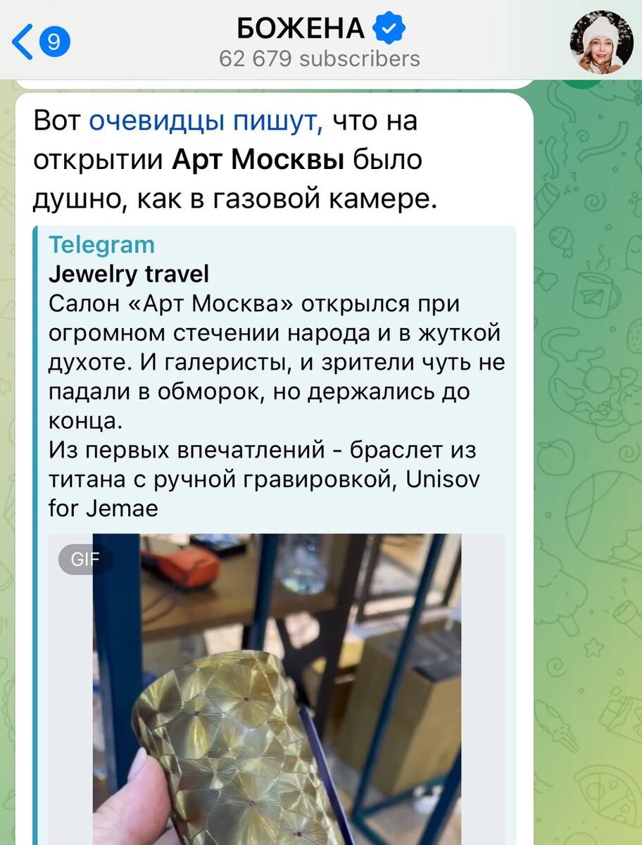 Рубрика «инсайды Божены»: «очевидцы пишут, что на открытии Арт Москвы было душно». Гостиный двор. В Москве +23 солнечно. Толпа людей под стеклянной крышей. Ну там в принципе не бывает по-другому при таких вводных 🥹