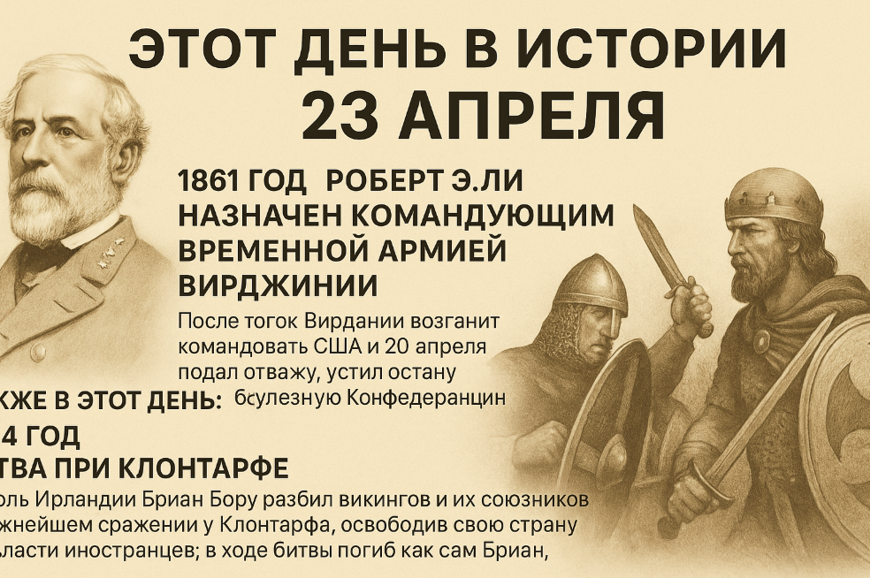 📅 Этот день в истории — 23 апреля Несмотря на насыщенную военную историю, в этот день — 23 апреля — мало что произошло интересного. Можно отметить два события: Гражданскую войну в Америке и разбитых викингов. 1861 год — Роберт Э. Ли назначен командующим Временной армией Вирджинии