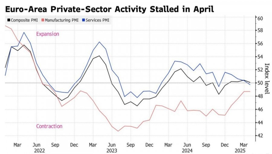 В торговых войнах не будет победителей. США пострадают из-за потери доверия к доллару и другим американским активам, Европа – из-за замедления экономики. Которое уже начинает ощущаться. Композитный индекс менеджеров по закупкам еврозоны в апреле снизился до 50,9, не оправдав ожидания экспертов Bloomberg. Две крупнейшие экономики валютного блока в лице Германии и Франции оказались ниже критического уровня 50, отделяющего расширение от сокращения.