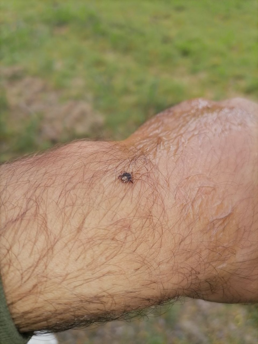 Сижу монтирую ролик вчерашней рыбалки. Не без приключений собственно)) Полностью весь одетый. Куртка, штаны. И чисто случайно обратил внимание на свое запястье. Клещ! Во гадина и как я его не заметил. Ногтем не отрывается. Тут самое главное его не раздавить. Полил его подсолнечный масло и кончиком ножа аккуратно стал поддевать под ешо "клещи". Отцепил. Благо он не успел присосаться. Даже следа нет от его укуса. Рыбалка на 5 с минусом. Ночью активно ловился сомик, правда мелковат. Одного все же взял на 5+кг. Днем на червя клев такой себе, много мелочи. И чисто случайно попался сазан на червя. Закинул и сразу он взял! Подсак как всегда далеко. Побежал за подсаком. Сазан ровно на 3 кг. На жмых ни одной поклевки. Погода поменялась. Протестировал свою новую большую палатку. Тяжелая, но офигенная😊