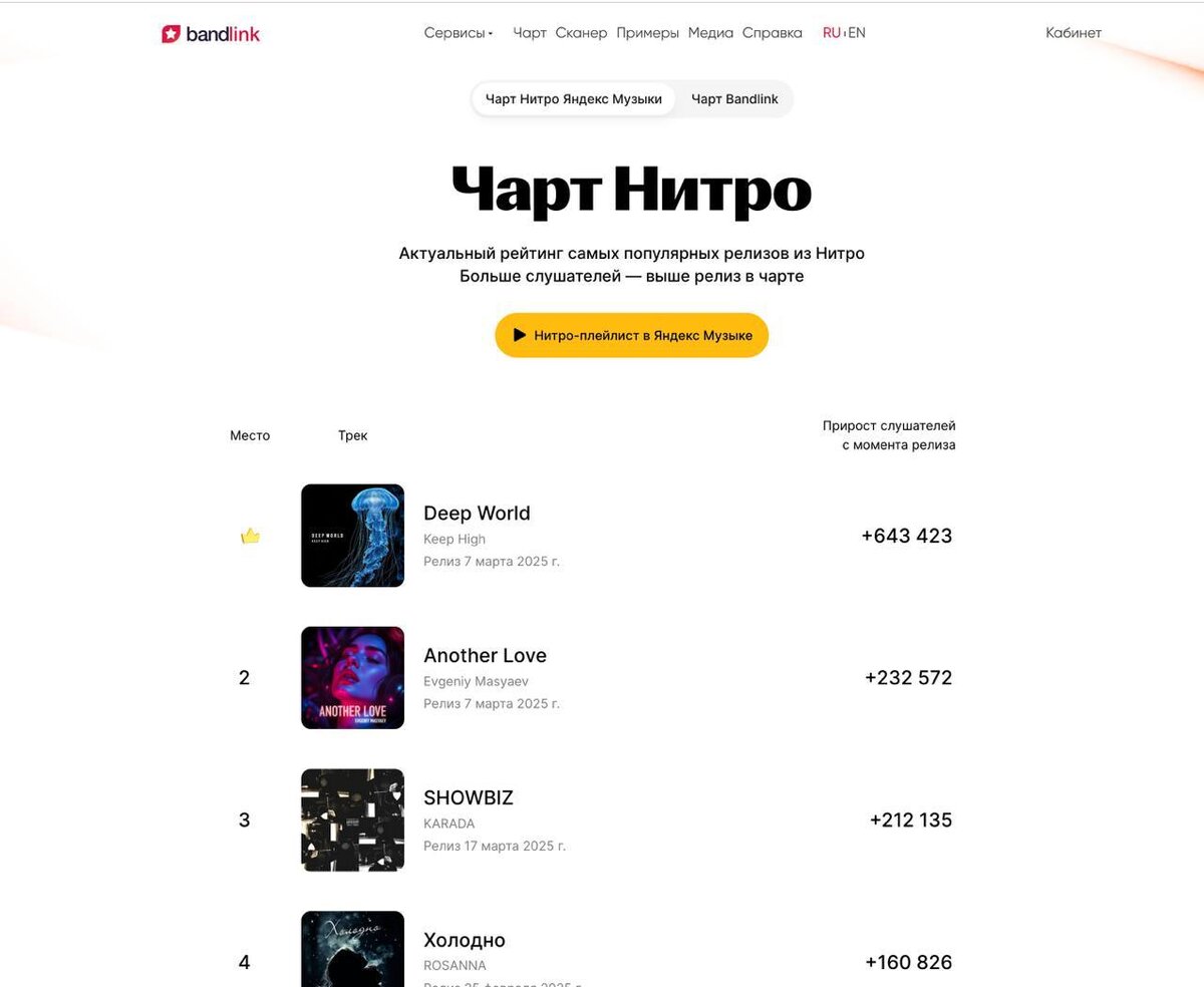 Артисты часто говорят: «Инструментал сейчас не выстрелит». А сегодня захожу в чарт Нитро от Яндекс.Музыки — и на первом месте инструментальный трек Deep World от Keep High. +643 423 новых слушателя благодаря Нитро Это отличный кейс, который снова подтверждает: 🎧 жанр — не главное. Работает запуск, упаковка и стратегия. Если трек цепляет и правильно оформлен — алгоритмы подхватывают. А дальше всё зависит от того, как артист выстроил воронку и работу с аудиторией. Так что — не списывайте инструментал со счетов 🙂😉
