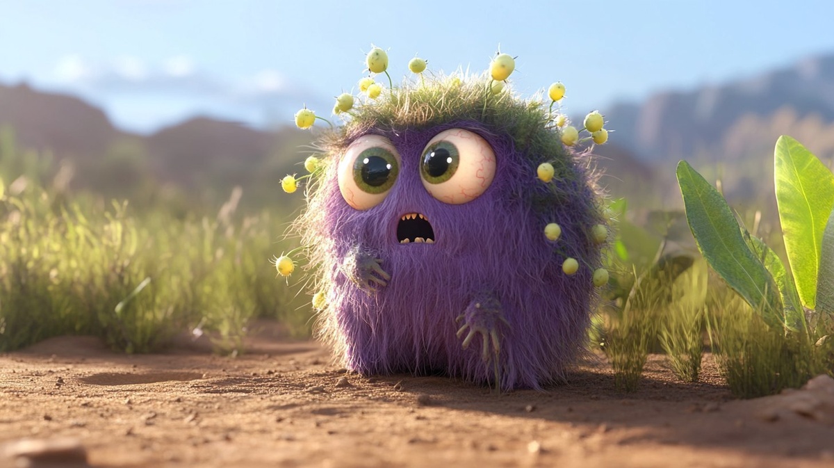 Создано на основе запроса: A purple and green cartoon monster with multiple eyes, covered in long fur, standing on the desert ground. It has three large eyeballs on its head, surrounded by small yellow-green dots that resemble thorns. The background features a blue sky and mountains. This is an illustration created using the C4D OC renderer with high resolution and a cinematic lighting style. --- Автоперевод: Фиолетовый и зеленый мультипликационный монстр с несколькими глазами, покрытый длинным мехом, стоящий на пустынной земле. Как тебе такая картинка? 🤔 https://dzen.ru/id/65c0c65c86e4f837c27b24d7 #ИИ #AI #нейросеть #midjourney #art