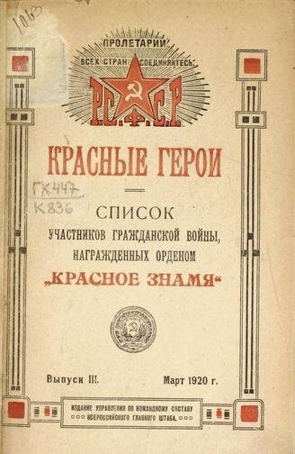 Красные герои.: список участников Гражданской войны, награжденных орденом "Красное Знамя". - [Пг. : Упр. по командному составу Всерос. гл. штаба, 1920]. https://disk.yandex.ru/i/JmgEXIFTDRn_zw стр. 3-4, 8, 11-13, 29-31, 33, 36