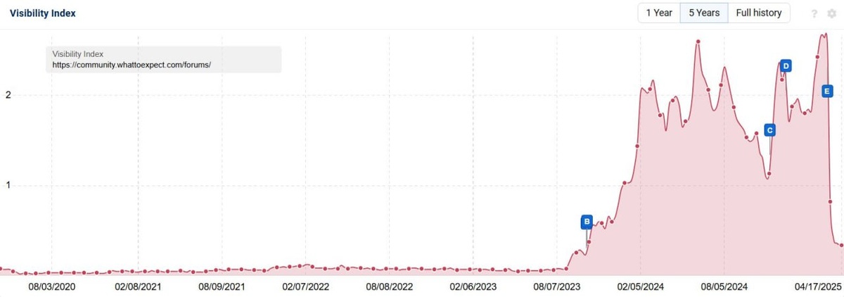Трафик на форум из Google... Тут не объем, а некий коэф. визибилити (не знаю, как перевести). Хороший пример того, как последнее обновление ядра поиска повлияло на сайты форумов. Да и у нас есть просадки. Вывод? SEO - шаманство, никто ничего не знает, в любой момент ваш старинный и доверенный сайт могут смыть в унитаз и ничего вы с этим не сделаете. Кстати, форум популярный, а пишет про данный кейс спец по трафику. Русский ИТ бизнес